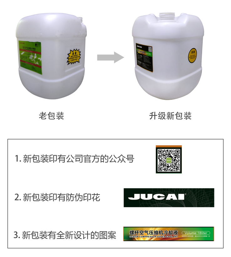 此冷却液是专为JUCAI螺杆空气压缩机研制的合成润滑油,油品性能及其稳定。因品牌持续强大,产品持续火红,调查发现有不法分子仿冒JUCAI品牌产品螺杆空气压缩机冷却液,为保障消费权益,树立更好的品牌形象,公司绝对严厉打击仿冒。公司在经过交流沟通后,特将包装做统一调整,并从2019年1月份新包装开始陆续推出,届时请各位顾客留意并及时关注。具体包装形象更改如下: