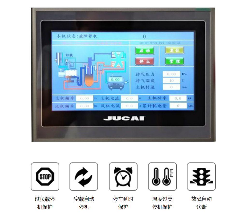 停机保护,空气过滤器、油过滤器,油气分离芯维护指示,并可显示三滤运行时间,全智能控